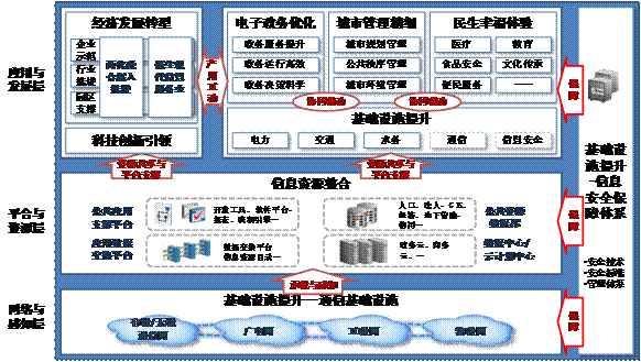 圍繞“智慧城市”建設(shè)實(shí)施的指導(dǎo)思想,以“統(tǒng)一規(guī)劃、集中管控、共建共享、業(yè)務(wù)協(xié)同”為原則,構(gòu)建包括應(yīng)用與發(fā)展層、平臺(tái)與資源層、網(wǎng)絡(luò)與感知層的“智慧城市”目標(biāo)體系架構(gòu)。其中,應(yīng)用與發(fā)展層是目標(biāo),是“智慧城市”建設(shè)成效的最終體現(xiàn);平臺(tái)與資源層是核心,是“智慧城市”集約建設(shè)、共建共享的關(guān)鍵環(huán)節(jié);網(wǎng)絡(luò)與感知層是支撐,是“智慧城市”業(yè)務(wù)運(yùn)行、信息交互和信息采集的堅(jiān)實(shí)基礎(chǔ)。
