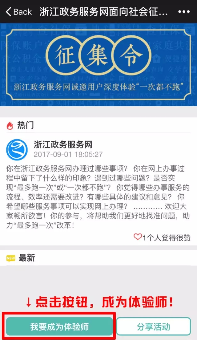 關(guān)注浙江政務服務網(wǎng)微信公眾號(zjzwfww),發(fā)送關(guān)鍵詞“體驗”即可進入活動頁面,寫下你的體驗與故事。