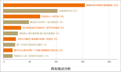 經(jīng)分析,在該條微博下,40%的網(wǎng)友留言為四川災(zāi)區(qū)祈福,希望“天佑四川一切平安”;30%的網(wǎng)友留言稱“有雅安的市民表示震感較弱”;15%的網(wǎng)友提醒“四川的小伙伴一定注意安全”;5%的網(wǎng)友希望現(xiàn)場(chǎng)人員可以注意余震;4%的網(wǎng)友表示自己去過九寨溝;3%的網(wǎng)友表示震中離景區(qū)很近?!捌桨病币辉~成為這一單條微博評(píng)論中被提及最高的詞匯,達(dá)37.3萬次;其次則是“四川”和“保佑”“天佑”。