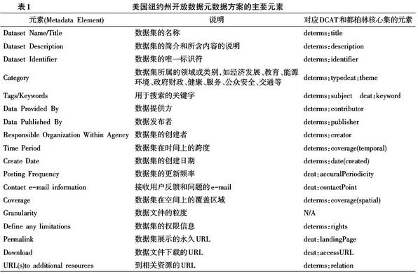 美國(guó)是開放政府?dāng)?shù)據(jù)的發(fā)起者和領(lǐng)跑者。從2009年5月21日上線發(fā)布國(guó)家層面的數(shù)據(jù)門戶Data.Gov,到2016年8月各級(jí)地方政府(州、縣和市)的開放數(shù)據(jù)門戶網(wǎng)站已達(dá)到88個(gè)。美國(guó)各級(jí)政府開放數(shù)據(jù)的元數(shù)據(jù)非常重視標(biāo)準(zhǔn)化工作,2014年11月6日更新的國(guó)家數(shù)據(jù)門戶的元數(shù)據(jù)方案(Project Open Data Metadata Schemav1.1,POD v1.1)已建立了到DCAT和Schema.org的映射。由于本文主要關(guān)注地方政府,就以紐約州為例介紹一個(gè)具體的元數(shù)據(jù)方案。