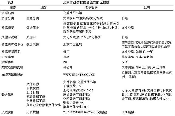 “北京市政務(wù)數(shù)據(jù)資源網(wǎng)”由北京市經(jīng)濟(jì)和信息化委員會(huì)(經(jīng)信委)牽頭建設(shè)、北京市各政務(wù)部門共同參與,于2012年10月推出測(cè)試版、2013年年底正式開通。目前已開放來(lái)自市教委、市交通委、市旅游委等近40個(gè)部門的300多個(gè)數(shù)據(jù)集,并為每個(gè)數(shù)據(jù)集提供了txt文本格式的元數(shù)據(jù)文件。表3總結(jié)了元數(shù)據(jù)情況,其中第一列的元素名稱取自元數(shù)據(jù)文件,第二列的元素標(biāo)簽取自HTML頁(yè)面,實(shí)例數(shù)據(jù)取自“公益性圖書館”數(shù)據(jù)集的描述信息(http://www.bjdata.gov.cn/zyml/azt/wtyy/whcs/whgz/3077.htm)。需要說(shuō)明的是,實(shí)際中并沒(méi)有“數(shù)據(jù)資源”這一元素,它是本文為了元數(shù)據(jù)的結(jié)構(gòu)更加簡(jiǎn)潔、明晰而引入的,實(shí)際使用的7個(gè)元素(文件名稱、下載次數(shù)、上傳日期、原始數(shù)據(jù)下載、空間數(shù)據(jù)下載、資源記錄數(shù)、數(shù)據(jù)文件大小)歸結(jié)為它的“修飾詞”。