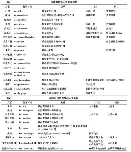表5給出了描述數(shù)據(jù)集的核心元數(shù)據(jù),第一列是規(guī)范化的元素中文名稱、第二列是對(duì)應(yīng)的DCAT元素,最后兩列對(duì)應(yīng)北京和浙江實(shí)際使用的元數(shù)據(jù)。19個(gè)元素全部來(lái)自DCAT詞匯表和DC元數(shù)據(jù),不僅能覆蓋北京、浙江等目前使用的絕大多數(shù)元數(shù)據(jù),也補(bǔ)充了“標(biāo)識(shí)符”“開放許可”和“聯(lián)系方式”等基本元素。
