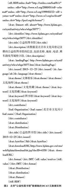 本文以北京市“公益性圖書館”數(shù)據(jù)集的元數(shù)據(jù)(參見2.1節(jié)的表3)為例,將現(xiàn)有的文本格式轉(zhuǎn)換為XML/RDF格式(見圖2)。其中,元素的名稱來(lái)自DCAT詞匯表,除了“標(biāo)識(shí)符”的值(圖中黑體),其余值都是實(shí)際數(shù)據(jù)??梢栽O(shè)想,如果各地方政府都以這種格式提供元數(shù)據(jù),應(yīng)用程序就能以一致的方式跨多個(gè)數(shù)據(jù)目錄讀取和解析它們,實(shí)現(xiàn)自動(dòng)查找、比較和選擇數(shù)據(jù)集,進(jìn)而自動(dòng)下載或訪問(wèn)數(shù)據(jù)。