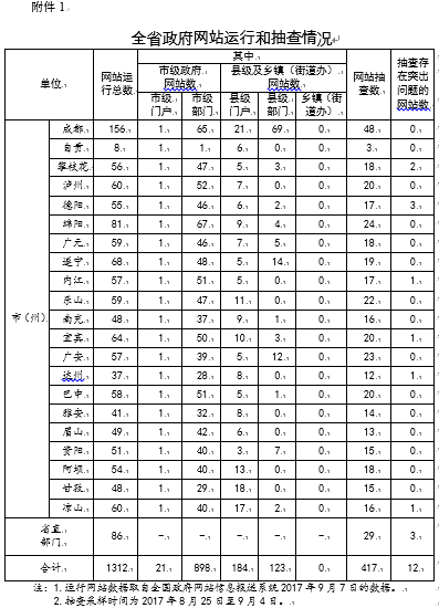 (一)全省政府網(wǎng)站抽查情況。截至2017年9月7日,全省正在運(yùn)行的政府網(wǎng)站1312個(gè)。其中,省直部門網(wǎng)站86個(gè),市級(jí)政府門戶網(wǎng)站21個(gè),市級(jí)部門網(wǎng)站898個(gè),縣級(jí)政府門戶網(wǎng)站184個(gè),縣級(jí)部門網(wǎng)站123個(gè)。省政府辦公廳組織隨機(jī)抽查并人工復(fù)核417個(gè),總體合格率97.1%。其中,成都、甘孜等15個(gè)市(州)政府網(wǎng)站抽查合格率為100%;成都、遂寧、樂(lè)山、南充、廣安、巴中、雅安和眉山等8個(gè)市(州)連續(xù)三個(gè)季度抽查合格率達(dá)100%。