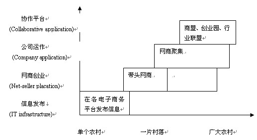 農村電子商務發(fā)展演進過程存在一個由基礎信息發(fā)布和服務開始,進而發(fā)展到有局部或單獨的電子交易行為,到成片成群的聚集發(fā)展,到高級的商盟或行業(yè)聯(lián)盟等形式,進而可以推而廣之,覆蓋到更為廣大的農村地區(qū)。農村電子商務在各級政府和廣大農民的共同努力下,呈現跨越式發(fā)展的態(tài)勢。