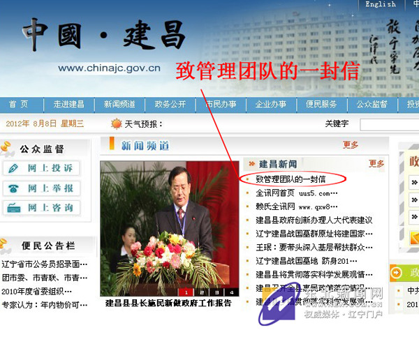 根據(jù)網(wǎng)友提供的線索,記者登陸了建昌縣政府網(wǎng)站,在首頁(yè)建昌新聞欄目中看到,8月3日分別出現(xiàn)了《致管理團(tuán)隊(duì)的一封信》等三篇文章。《致管團(tuán)隊(duì)的一封信》一文出現(xiàn)了以下內(nèi)容: