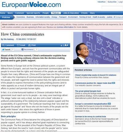 中新網(wǎng)9月19日電 據(jù)外交部網(wǎng)站消息,日前,中國(guó)駐歐盟使團(tuán)團(tuán)長(zhǎng)吳海龍大使在英文周報(bào)《歐洲之聲》發(fā)表題為《中國(guó)政府與民眾的溝通之道》的文章,稱網(wǎng)絡(luò)問政成為中國(guó)推進(jìn)民主法制建設(shè)的新形式和新渠道,促進(jìn)了政府與公民之間直接、即時(shí)、高效、互動(dòng)的交流與溝通。