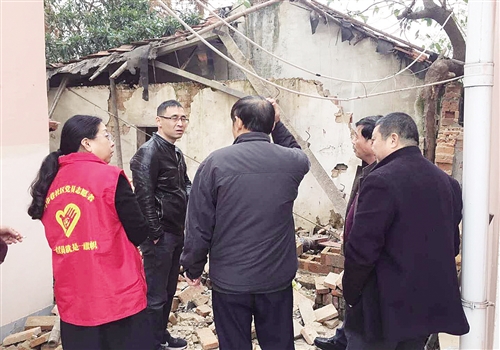 網(wǎng)格員和志愿者在街道上巡查安全隱患。 林紫曉攝
