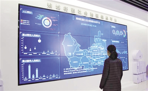 雉城街道社會(huì)治理創(chuàng)新實(shí)踐中心,大屏幕正在演示雉城街道社會(huì)治理綜合信息平臺(tái)。 林紫曉攝