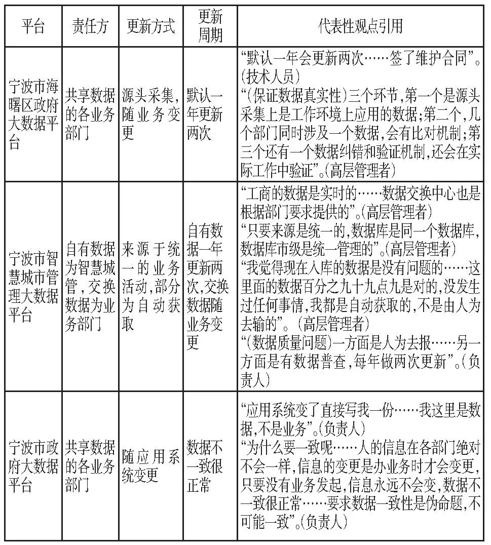與之相反, 由于各部門業(yè)務活動的差異, 數(shù)據(jù)不一致被視作正常。在寧波市大數(shù)據(jù)中心調(diào)研過程中, 平臺的負責人明確表示:數(shù)據(jù)不可能一致。關(guān)于數(shù)據(jù)不一致的原因與業(yè)務活動密切相關(guān):第一, 業(yè)務部門承擔業(yè)務活動, 即使是同一主體的數(shù)據(jù)同樣會因業(yè)務活動的差異存在不一致;第二, 由于三個政府大數(shù)據(jù)平臺的建設者和使用者之間不存在直接的領導隸屬關(guān)系, 即使數(shù)據(jù)不一致, 平臺僅有告知的責任與義務, 并無強制執(zhí)行的權(quán)力和保障;第三, 對于業(yè)務部門而言, 由于數(shù)據(jù)的采集和使用有責任單位, 業(yè)務部門不具有使用其他業(yè)務部門數(shù)據(jù)的權(quán)利。