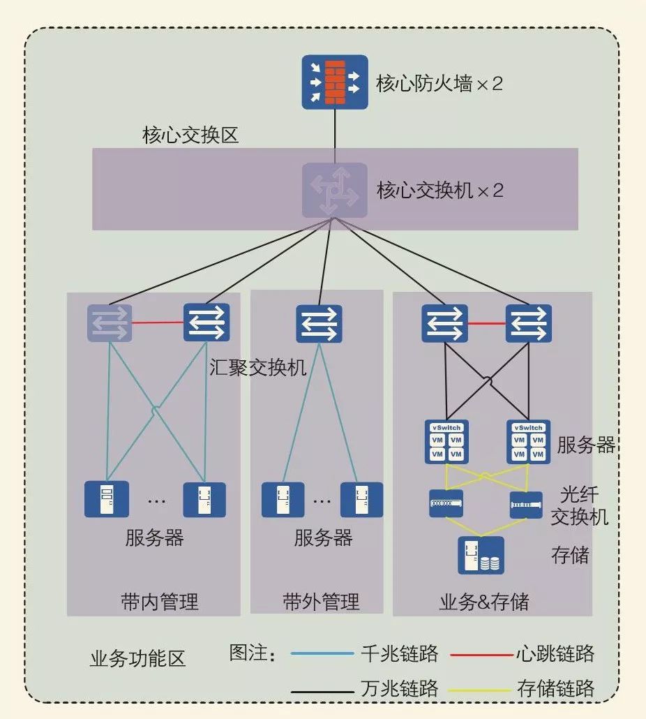 業(yè)務(wù)功能區(qū)按照業(yè)務(wù)部署和運行要求, 劃分為業(yè)務(wù)區(qū)、測試區(qū)和大數(shù)據(jù)區(qū), 滿足不同性能要求的業(yè)務(wù)系統(tǒng)部署。各區(qū)可在存儲設(shè)備上劃分不同的存儲池, 但采用相同的網(wǎng)絡(luò)方案接入核心交換區(qū)可簡化網(wǎng)絡(luò)設(shè)計, 降低維護難度。單臺機架服務(wù)器分別連接業(yè)務(wù)網(wǎng)絡(luò)、存儲網(wǎng)絡(luò)、管理網(wǎng)絡(luò)三個不同的網(wǎng)絡(luò)平面:業(yè)務(wù)網(wǎng)絡(luò)服務(wù)器提供萬兆光口對接接入交換機, 提供業(yè)務(wù)數(shù)據(jù)訪問網(wǎng)絡(luò), 通過大帶寬滿足業(yè)務(wù)交互和對外提供服務(wù)的帶寬要求;存儲網(wǎng)絡(luò)服務(wù)器提供光纖接口, 采用光纖交換機構(gòu)建獨立的光纖網(wǎng)絡(luò), 實現(xiàn)SAN存儲設(shè)備的高速訪問;管理網(wǎng)絡(luò)帶外管理采用千兆網(wǎng)絡(luò), 接入帶外管理交換機, 提供物理設(shè)備帶外管理, 帶內(nèi)管理流量接入業(yè)務(wù)交換機, 通過VLAN與業(yè)務(wù)平面實現(xiàn)邏輯隔離, 通過鏈路的主備綁定, 提升管理網(wǎng)絡(luò)的可靠性。