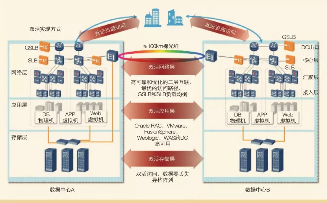 政務(wù)云承載著大量政務(wù)系統(tǒng), 其重要性不言而喻。為了保證系統(tǒng)的高可靠性, 可以通過建設(shè)雙活數(shù)據(jù)中心進行異地容災(zāi), 確保在單個政務(wù)云節(jié)點出現(xiàn)故障的情況下, 業(yè)務(wù)可以切換至容災(zāi)節(jié)點。政務(wù)云要實現(xiàn)雙活, 必須在各個層面實現(xiàn)災(zāi)備設(shè)計, 具體如圖4所示。