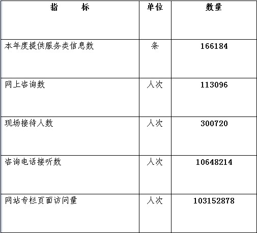 全市共有1106.2萬人次通過各種方式咨詢與政府信息公開有關(guān)的事務(wù),其中現(xiàn)場咨詢30.07萬人次,占2.7%;電話咨詢1064.82萬人次,占96.3%;網(wǎng)上咨詢11.31萬人次,占1%。