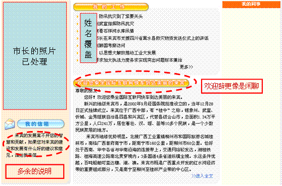 內容龐雜啰嗦,各式各樣的形容詞、歡迎辭堆積,這是我國政府網站的一大通病。以我國某市政府網站市長之窗為例,用戶所需的一般是市長的簡歷、聯系方式和近期工作等信息,而“我的信箱”的說明和“歡迎辭”欄目占用了大幅的頁面空間,明顯妨礙了用戶并降低了他們的效率。