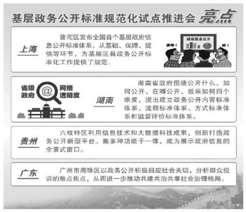 國辦部署的試點工作,重點任務(wù)包括梳理公開事項、編制公開標(biāo)準(zhǔn)、優(yōu)化公開流程、完善公開方式,其目標(biāo)是形成可復(fù)制、可推廣、可考核的基層政務(wù)公開標(biāo)準(zhǔn)和規(guī)范。