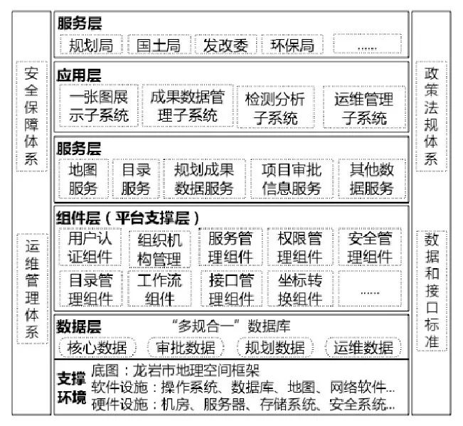 “多規(guī)合一”基礎(chǔ)信息平臺的系統(tǒng)架構(gòu)分為:支撐環(huán)境層、數(shù)據(jù)層、組件層、服務(wù)層、應(yīng)用層、用戶層, 以及數(shù)據(jù)和接口標(biāo)準、安全保障體系、運維保障體系和政策法規(guī)體系, 如圖1。