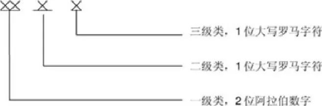 主題的分類主要是利用線性分類的模式, 主要包含三級四位代碼。其中, 第一級包含了2位阿拉伯?dāng)?shù)字, 具體分為20大類;第二級為1個羅馬字符, 利用A-Z來加以表示, 主要體現(xiàn)分類的層級;第三級分類為1個羅馬字符, 利用A-Z來加以表示, 其結(jié)構(gòu)如圖2所示。