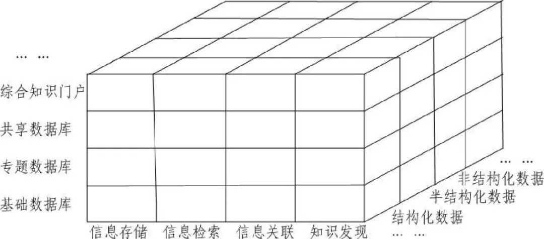 信息資源整合包含資源維度、服務(wù)維度以及應(yīng)用維度。其中, 資源維度主要表示信息資源的類型, 從結(jié)構(gòu)化到半結(jié)構(gòu)化資源, 最后到非結(jié)構(gòu)化資源, 逐漸拓寬資源整合的范圍;服務(wù)維度就是呈現(xiàn)信息資源整合利用效率, 包含從“信息存儲”一直到“信息檢索”, 然后到“信息關(guān)聯(lián)”與“知識發(fā)現(xiàn)”的服務(wù)過程, 并且在這一個過程中, 信息處理智能化程度也在進一步增強;應(yīng)用維度則是對電子政務(wù)信息資源整合層次的體現(xiàn), 從“基本數(shù)據(jù)庫”到“專題數(shù)據(jù)庫”, 然后再到“共享數(shù)據(jù)庫”和“綜合知識門戶”, 在這一個過程中, 資源整合的層次得到進一步提升。政務(wù)信息資源整合的維度和視圖, 如圖4和圖5所示。