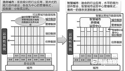 隨著城市人口的聚集,產(chǎn)業(yè)的升級發(fā)展,人們對生活質(zhì)量期望的提升,城市各行業(yè)領(lǐng)域都迫切地需求借助信息化手段提升社會管理效率和公共服務(wù)的能力。信息城市階段,城市各行業(yè)領(lǐng)域建立各自的信息化系統(tǒng),各行業(yè)信息化系統(tǒng)彼此獨立,信息資源沒有進行有效的匯聚整合和共享。智慧城市階段就是通過增加跨行業(yè)領(lǐng)域的運營中心,匯集整個城市運營層面的數(shù)據(jù),將原有的行業(yè)信息化延展為社會信息化,并將社會管理納入統(tǒng)一系統(tǒng),為分析各行業(yè)領(lǐng)域相關(guān)性,實現(xiàn)智慧決策創(chuàng)造了條件。智慧城市相對信息城市來講,加強了各行業(yè)系統(tǒng)及數(shù)據(jù)之間的相關(guān)性,通過關(guān)聯(lián)關(guān)系挖掘新的價值,不再單純追求因果關(guān)系的分析。