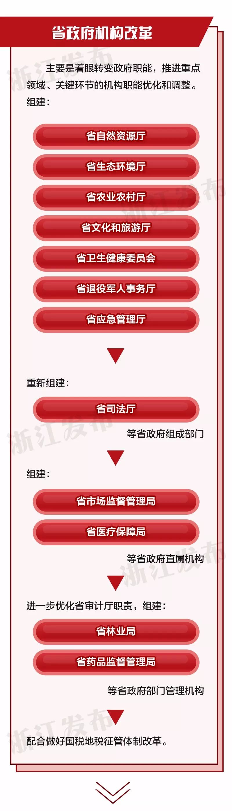 深化機構(gòu)改革,要認(rèn)真貫徹落實習(xí)近平總書記對浙江工作的重要指示精神,按照“干在實處永無止境,走在前列要謀新篇,勇立潮頭方顯擔(dān)當(dāng)”要求,從機構(gòu)職能上把加強黨的領(lǐng)導(dǎo)落實到各領(lǐng)域各方面各環(huán)節(jié),省市縣主要機構(gòu)設(shè)置同中央保持基本對應(yīng);以深化“最多跑一次”改革為牽引,加快政府職能轉(zhuǎn)變,使市場在資源配置中起決定性作用、更好發(fā)揮政府作用,強化社會管理和公共服務(wù)職能,切實解決人民群眾最關(guān)心最直接最現(xiàn)實的利益問題;統(tǒng)籌省市縣鄉(xiāng)各層級、黨政群各領(lǐng)域改革,優(yōu)化機構(gòu)設(shè)置和職能配置,提高效率效能;充分發(fā)揮法治規(guī)范和保障改革作用,在改革中完善和強化法治,堅決維護國家法制統(tǒng)一、政令統(tǒng)一、市場統(tǒng)一;結(jié)合浙江實際,因地制宜,大膽探索機構(gòu)設(shè)置和職能配置,構(gòu)建系統(tǒng)完備、科學(xué)規(guī)范、運行高效的機構(gòu)職能體系,再創(chuàng)體制機制新優(yōu)勢,為推進“八八戰(zhàn)略”再深化、改革開放再出發(fā),加快浙江高水平全面建成小康社會、高水平推進社會主義現(xiàn)代化建設(shè)提供堅強有力的體制機制保障。