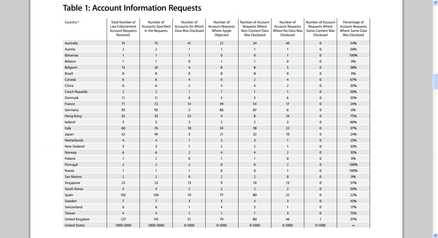 2013前半年,美國政府向蘋果進(jìn)行的設(shè)備相關(guān)數(shù)據(jù)請求共3542次,涉及設(shè)備數(shù)量8605,蘋果透露數(shù)據(jù)的請求共3110次,占比88%。中國政府向蘋果進(jìn)行的設(shè)備相關(guān)數(shù)據(jù)請求共585次,涉及設(shè)備數(shù)量1268臺,蘋果透露數(shù)據(jù)的請求共429次,占比73%。詳細(xì)信息見下表。