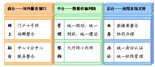 “后臺(tái)”是政府辦公辦事的各種應(yīng)用支持系統(tǒng)。通過統(tǒng)一公務(wù)員辦公門戶、統(tǒng)一用戶身份認(rèn)證、統(tǒng)一用戶權(quán)限管理、統(tǒng)一郵件系統(tǒng)管理、統(tǒng)一標(biāo)準(zhǔn)的電子檔案存儲(chǔ),將直接提升政府辦公效率、降低政府運(yùn)營成本,進(jìn)而實(shí)現(xiàn)真正意義上的電子政府。