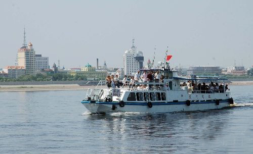 6月17日,中國(guó)游客乘船游覽黑龍江。中國(guó)黑河市與俄羅斯布拉戈維申斯克市隔黑龍江相望,兩岸經(jīng)濟(jì)互補(bǔ)發(fā)展迅速。來(lái)邊城乘船游江的人逐年增多,欣賞兩岸獨(dú)特秀麗風(fēng)光,體驗(yàn)界江和平安祥的美好生活。