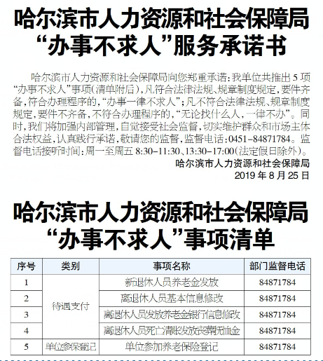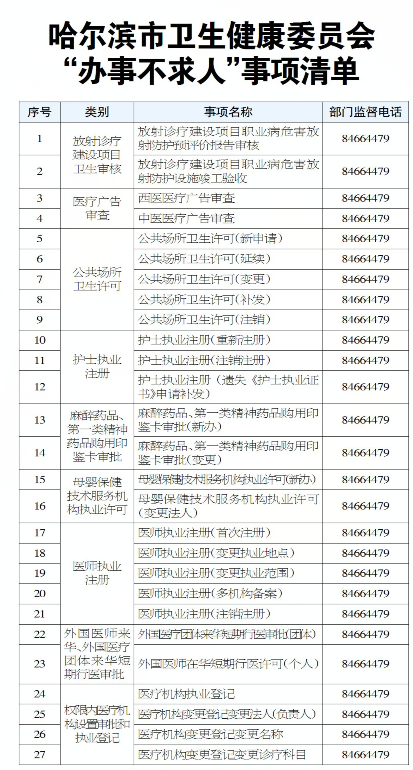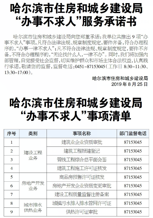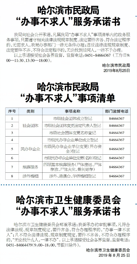 為貫徹落實省政府工作報告提出的“辦事不求人”要求,切實解決群眾、市場主體在日常生活和生產(chǎn)經(jīng)營中遇到的辦事求人問題。哈爾濱市市場監(jiān)督管理局、哈爾濱市民政局、哈爾濱市衛(wèi)生健康委員會、哈爾濱市人力資源和社會保障局、哈爾濱市住房和城鄉(xiāng)建設局、哈爾濱住房公積金管理中心6家單位梳理了第二批市級“辦事不求人”事項清單共計100項,現(xiàn)予以公布?!稗k事不求人”事項清單實行動態(tài)管理,根據(jù)法律、法規(guī)、規(guī)章等辦事依據(jù)變化情況,及時對事項進行調整和完善?!稗k事不求人”事項清單將分批次對外公布,最終實現(xiàn)全覆蓋。清單中所列事項辦事指南可在哈爾濱政務服務網(wǎng)(http://zwfw.harbin.gov.cn),部門網(wǎng)站及各單位對外辦事窗口進行查詢。歡迎社會各界對“辦事不求人”工作建言獻策,各單位將自覺主動接受監(jiān)督,對違諾失信行為將嚴肅追究相關人員責任。全市統(tǒng)一監(jiān)督投訴電話:0451-12388。