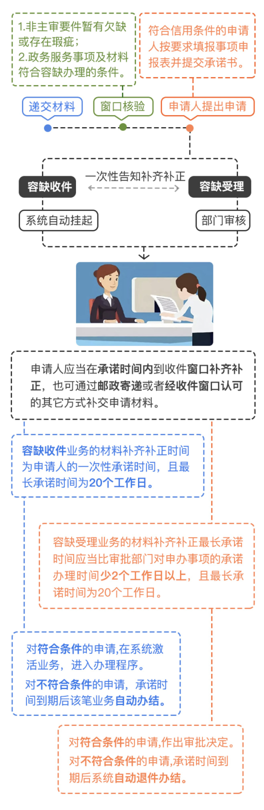 “容缺辦理”包括容缺收件和容缺受理,是辦事時(shí)的非主審要件暫有欠缺或存在瑕疵,窗口可先予收件或?qū)徟块T先予受理的政務(wù)服務(wù)活動(dòng)。容缺受理后業(yè)務(wù)進(jìn)入審批流程,并開始計(jì)時(shí),在收到申請(qǐng)人補(bǔ)齊補(bǔ)正的材料后正式出證。補(bǔ)齊補(bǔ)正承諾時(shí)限須比事項(xiàng)的承諾辦理時(shí)間少2個(gè)工作日以上,且最長不超過20個(gè)工作日。