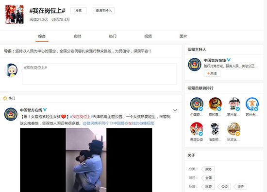 公安部發(fā)起的“我在崗位上”活動(dòng),在微博上閱讀21.3億,討論78.4萬(wàn)。