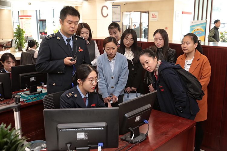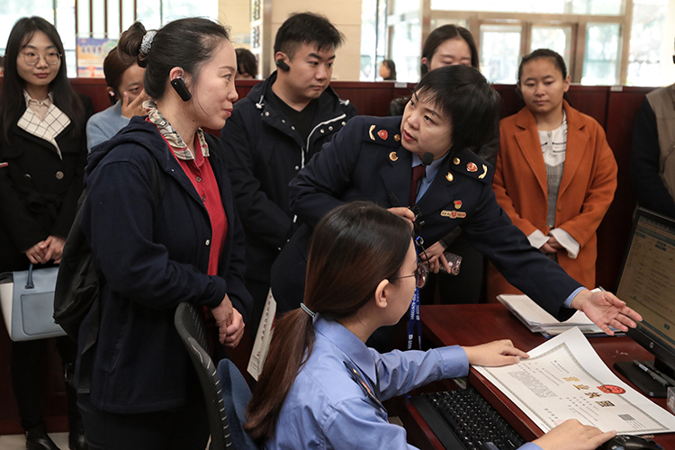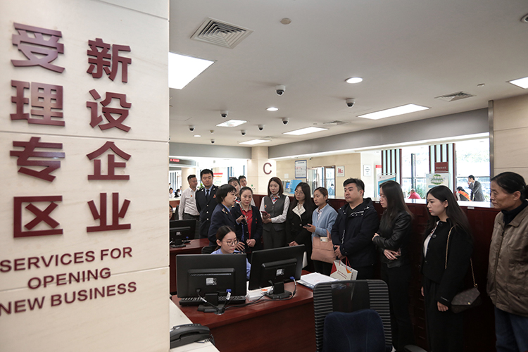 群眾代表在工作人員的帶領(lǐng)下,觀看營業(yè)執(zhí)照的申領(lǐng)流程。
