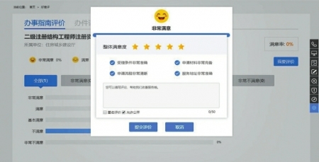 根據(jù)設(shè)計,“好差評”的評價等級分為五個,即分為非常滿意、滿意、基本滿意、不滿意、非常不滿意。評價采取實名制,辦事企業(yè)和群眾每辦理一次政務(wù)服務(wù)事項,都可以在辦理完畢后評價一次。