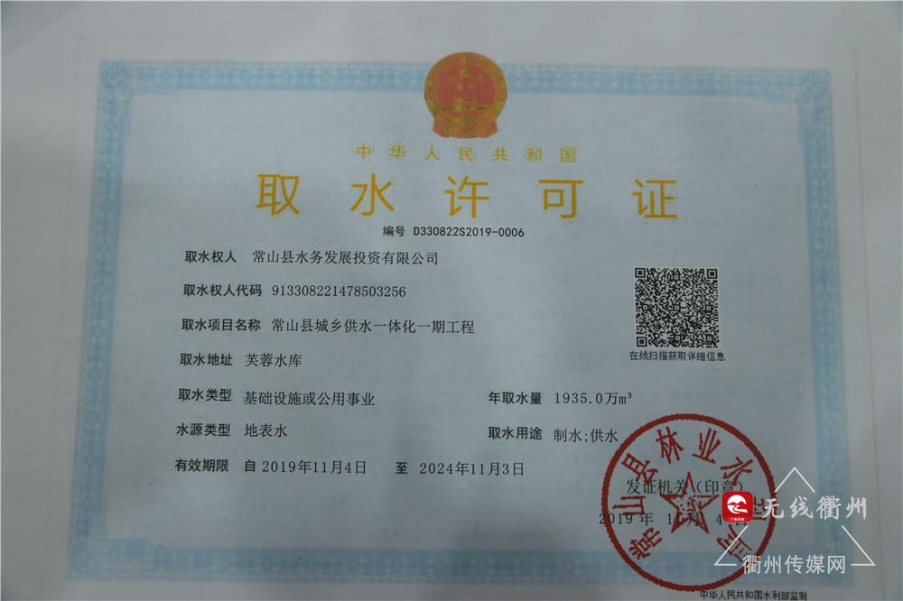 今天,常山縣水務(wù)發(fā)展投資有限公司在衢州市行政服務(wù)中心領(lǐng)取了取水許可電子證照。這可是全國首張取水許可電子證照哦~