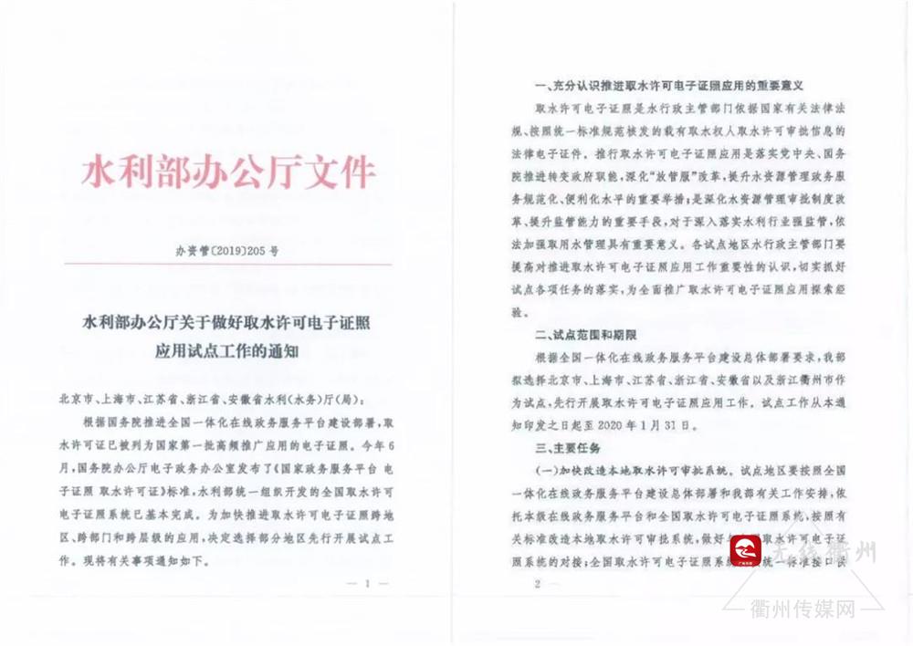 今年9月份,衢州與北京市、上海市、江蘇省、浙江省、安徽省一起被水利部列入全國取水許可電子證照試點(diǎn),是全國六個(gè)試點(diǎn)中的唯一地級(jí)市。