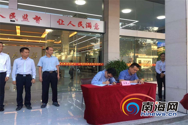萬寧市行政審批服務(wù)局局長茹祥與行政許可事項劃出單位代表市衛(wèi)生健康委員會主任吳云峰簽訂行政許可事項劃轉(zhuǎn)審管銜接備忘錄。 南海網(wǎng)記者 王康泰攝