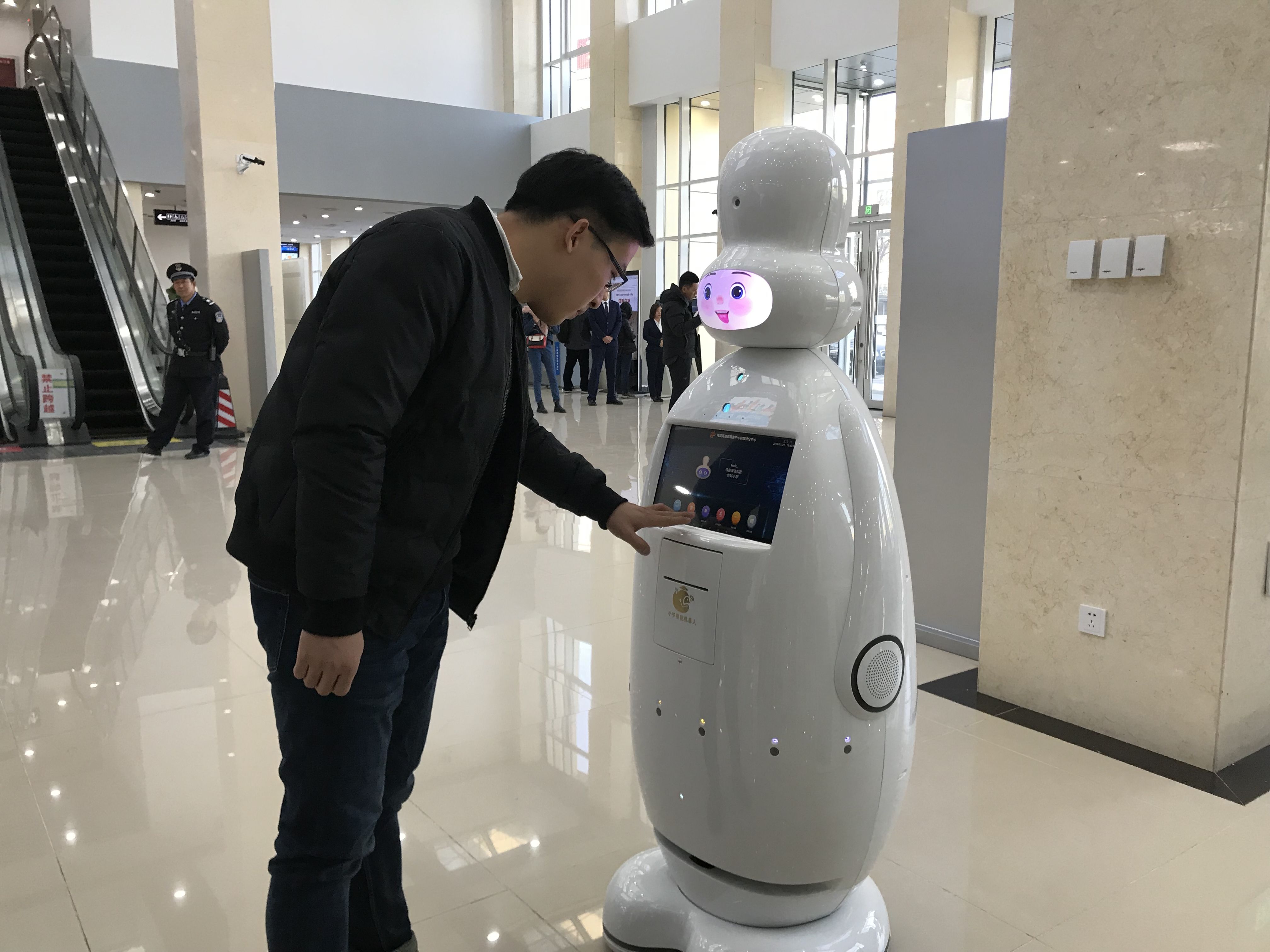 新政務服務大廳設置的可移動機器人。攝/新京報記者 陳琳