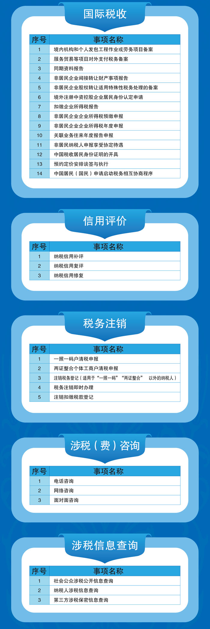 據(jù)悉,該清單結(jié)合長三角五省市實(shí)際,統(tǒng)一明確對14大類199項(xiàng)依納稅人申請事項(xiàng)辦理“最多跑一次”,主要包括信息報(bào)告、發(fā)票辦理、申報(bào)納稅、優(yōu)惠辦理、證明辦理、社會保險(xiǎn)費(fèi)及非稅收入業(yè)務(wù)、出口退(免)稅、國際稅收、信用評價(jià)、稅務(wù)注銷、涉稅(費(fèi))咨詢、涉稅信息查詢、納稅服務(wù)投訴、涉稅專業(yè)服務(wù)等方面。