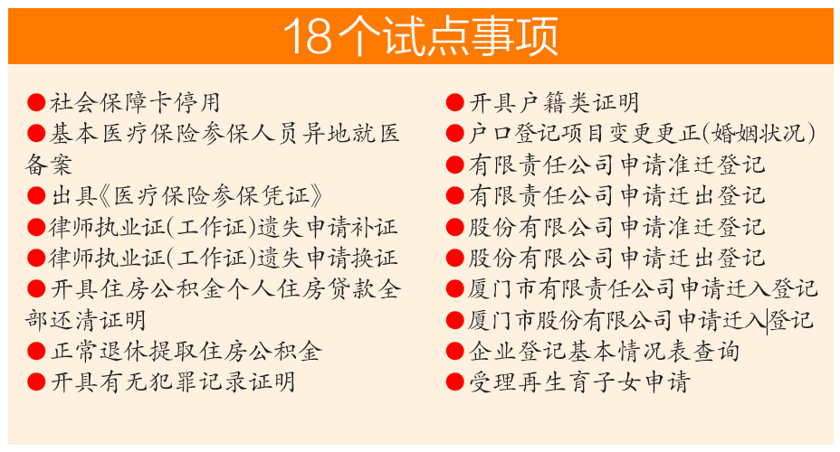 按照以往的做法,在異地工作和生活的人,辦事得在戶籍地和工作地之間來回跑。今起,廈門市各行政服務中心等辦事窗口即可受理試點事項異地辦理申請。試點工作圍繞醫(yī)療、社保、公安、商事登記等重點領域,首批梳理了包括社會保障卡停用、律師執(zhí)業(yè)證(就業(yè)證)遺失申請補證和換證、戶籍類證明、再生育子女證明等18項高頻個人和企業(yè)事項。