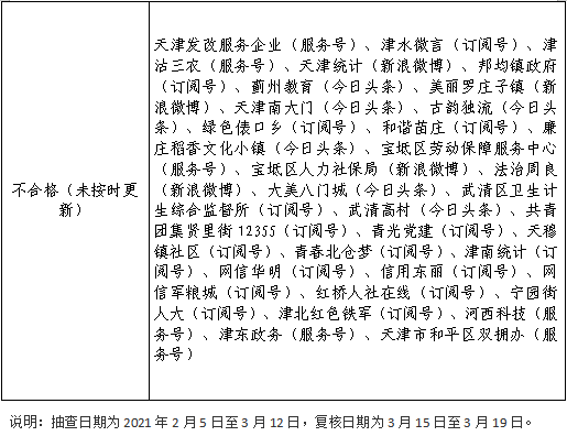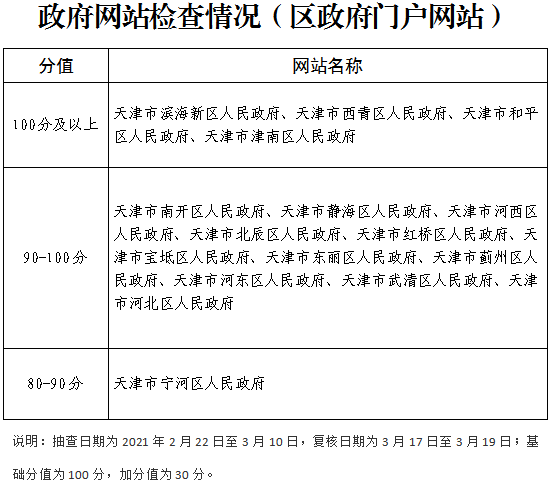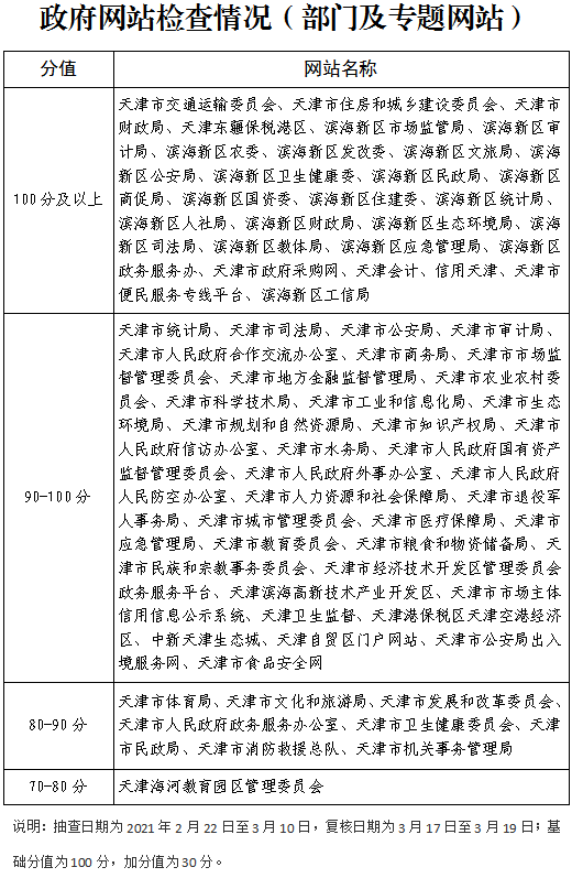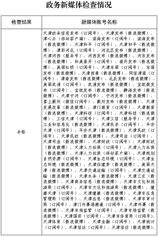 截止2021年3月25日,天津市登記備案的政府網(wǎng)站共90個(gè),政務(wù)新媒體1899個(gè),其中檢查政府網(wǎng)站90個(gè),檢查率100%,合格率100%;抽查政務(wù)新媒體193個(gè),抽查率10.16%,合格率83.42%。
