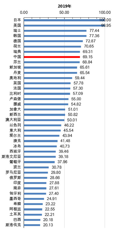 2019年我國(guó)知識(shí)產(chǎn)權(quán)發(fā)展?fàn)顩r國(guó)際比較得分