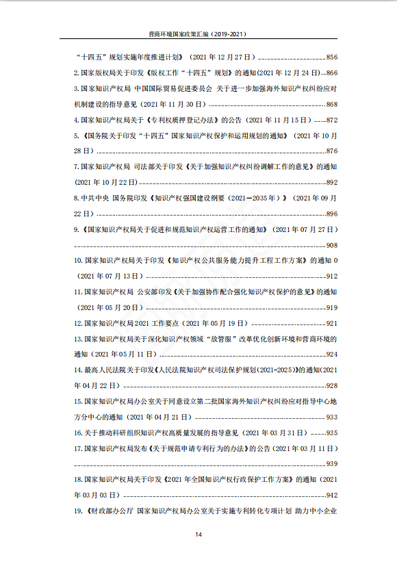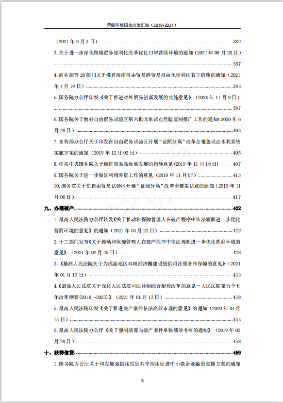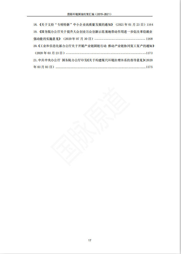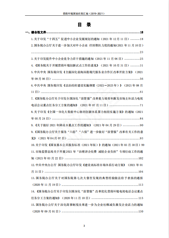 近年來,黨中央、國務(wù)院圍繞市場主體需求,以深化“放管服”為主要抓手,出臺了一系列政策文件,指引我國營商環(huán)境優(yōu)化工作的有序、有力開展。湖南國脈原道數(shù)據(jù)科技有限公司對國家層面2019年-2021年出臺的營商環(huán)境相關(guān)的政策文件、標(biāo)準(zhǔn)規(guī)范等進(jìn)行了匯編,按照國家發(fā)改委營商環(huán)境評價的18大指標(biāo)進(jìn)行了分類整理,共計200余個文件。該匯編將持續(xù)性更新,是各地各部門優(yōu)化營商環(huán)境工作開展的重要參考。