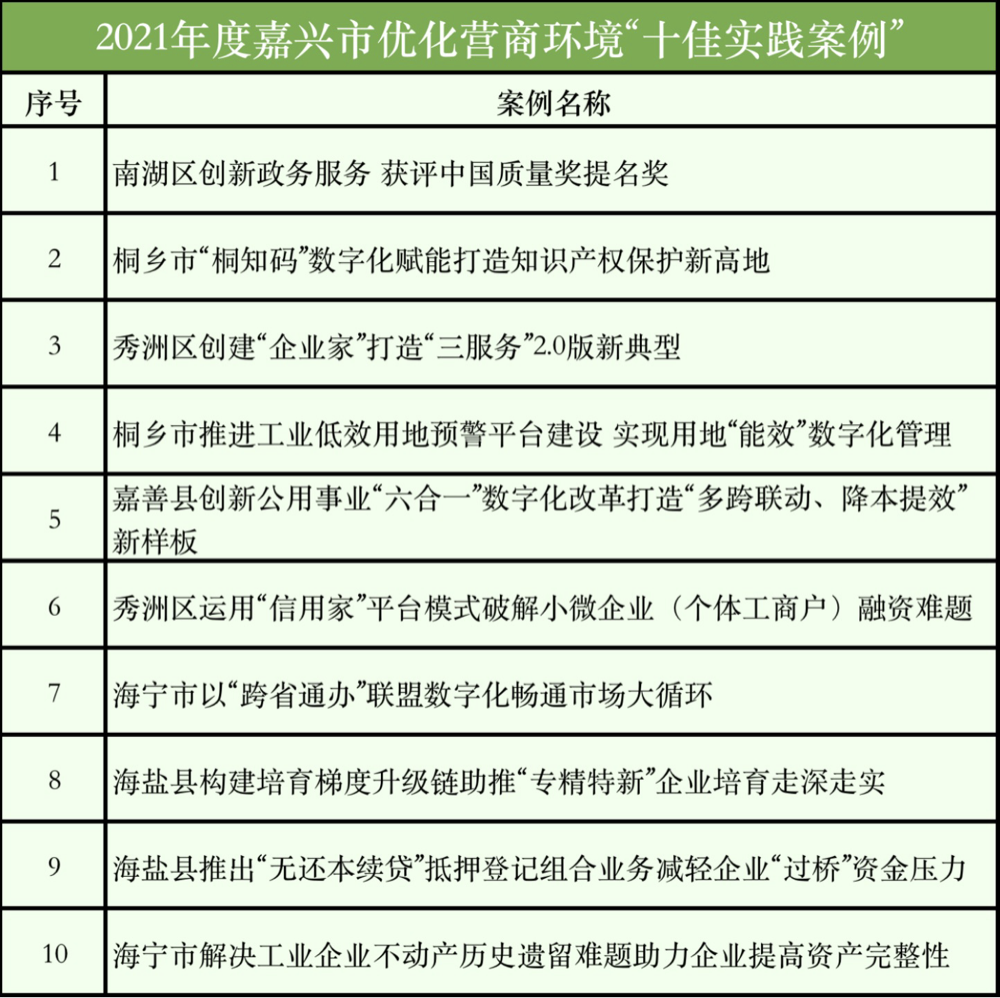 從嘉興市營商辦獲悉,2021年度嘉興市優(yōu)化營商環(huán)境“十佳實踐案例”在3月3日經(jīng)評選發(fā)布,旨在推廣一批可復(fù)制、可借鑒的優(yōu)化營商環(huán)境改革創(chuàng)新舉措及服務(wù)企業(yè)案例,不斷提高我市營商環(huán)境改革成效。