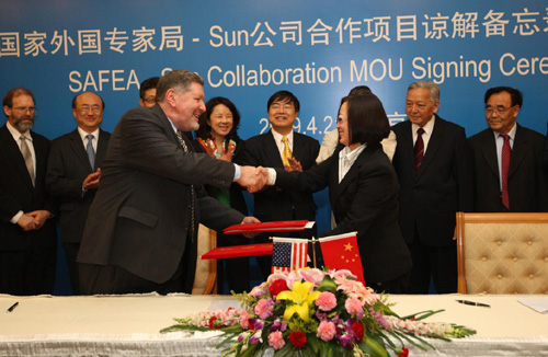 2009年4月21日,Sun Microsystems全球執(zhí)行副總裁兼亞太區(qū)主席Crawford Beveridge先生與中國(guó)國(guó)家外國(guó)專家局(SAFEA)副局長(zhǎng)李兵女士代表雙方簽署《面向高校管理者與骨干教師、IT人才,進(jìn)行素質(zhì)提升與能力建設(shè)》合作備忘錄,以支持中國(guó)國(guó)家人才培養(yǎng)計(jì)劃,通過(guò)開(kāi)源技術(shù)的力量,促進(jìn)高校管理者、骨干教師與IT人才、未來(lái)技術(shù)專家的素質(zhì)提升與能力建設(shè)。