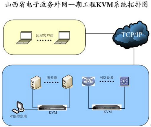為了提高系統(tǒng)運行維護管理水平,減少人員頻繁進出機房,減少鍵盤、鼠標(biāo)顯示器的數(shù)量,體現(xiàn)節(jié)能和環(huán)保的要求,曙光配備了高性能的KVM機房設(shè)備。通過KVM設(shè)備使機房所有的設(shè)備都可以到網(wǎng)絡(luò)/環(huán)境監(jiān)控中心進行管理和配置,實現(xiàn)遠程監(jiān)控。綜合考慮KVM系統(tǒng)需求,拓撲結(jié)構(gòu)如下: