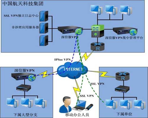 在中國航天科技集團(tuán)在總部部署一臺(tái)深信服SSL/IPSec 二合一VPN同時(shí)提供IPSec VPN組網(wǎng)以及SSL VPN接入兩種功能。對于數(shù)據(jù)量較大的大型分支采用IPSec VPN接入,其余分支則通過SSL VPN實(shí)現(xiàn)安全接入。