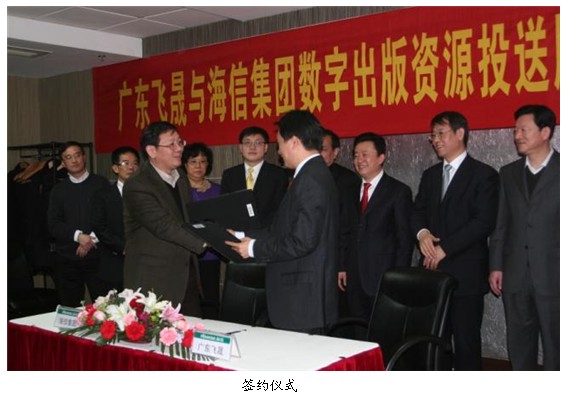 2010年12月28日,海信旗下傳媒網(wǎng)絡(luò)公司與廣東飛晟投資有限公司在青島海信大廈簽署戰(zhàn)略合作協(xié)議,就共同建設(shè)國(guó)家級(jí)數(shù)字出版平臺(tái)——廣東國(guó)家音樂(lè)創(chuàng)意產(chǎn)業(yè)基地,全面達(dá)成合作。國(guó)家新聞出版總署副署長(zhǎng)孫壽山、海信集團(tuán)總裁于淑珉,廣州開發(fā)區(qū)和省市領(lǐng)導(dǎo)等見(jiàn)證了簽約并表示祝賀。海信也借此正式進(jìn)軍數(shù)字出版產(chǎn)業(yè)。