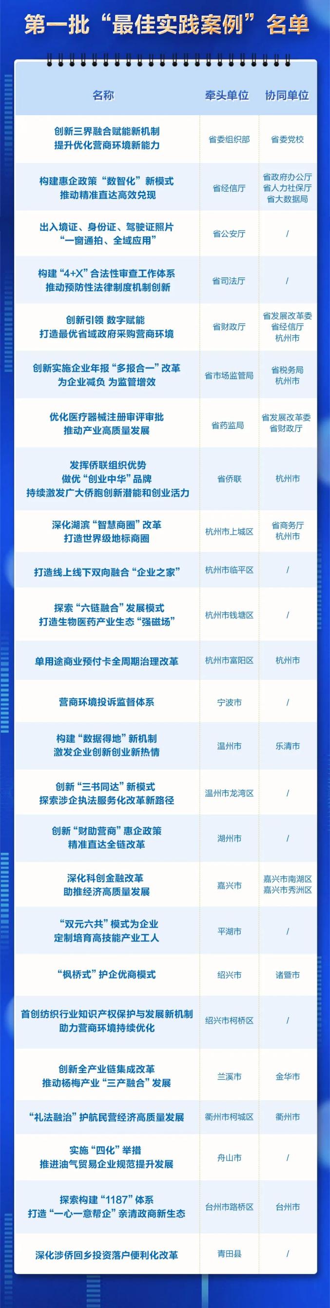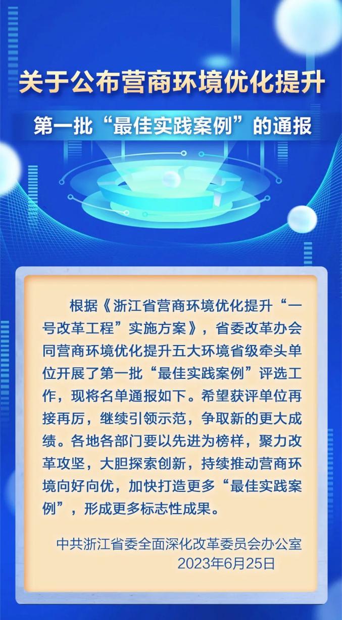 根據(jù)《浙江省營商環(huán)境優(yōu)化提升“一號改革工程”實施方案》,省委改革辦會同營商環(huán)境優(yōu)化提升五大環(huán)境省級牽頭單位,對第一批“最佳實踐案例”進行了評選,名單如下。