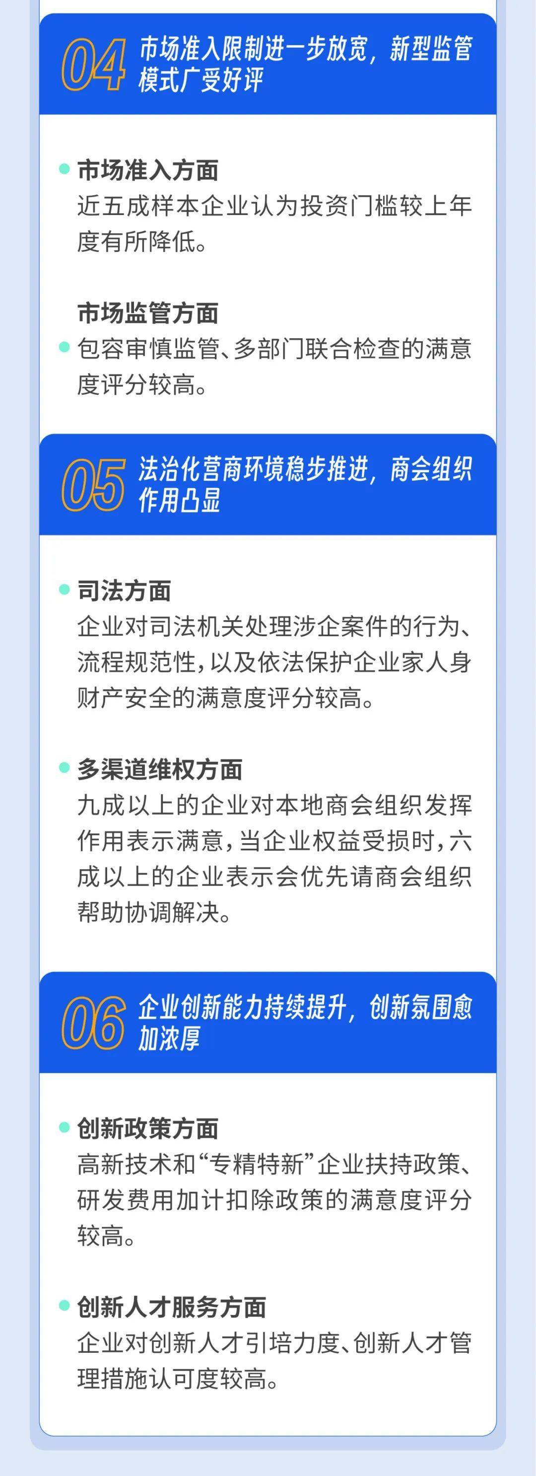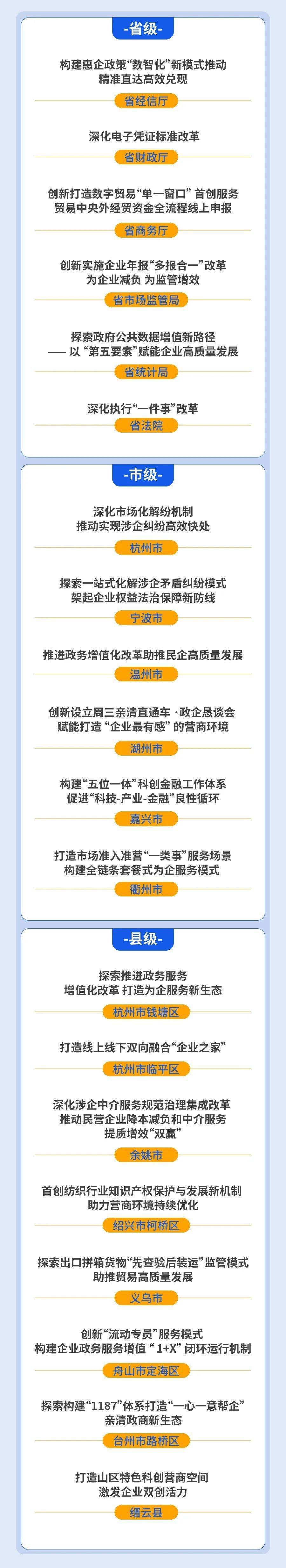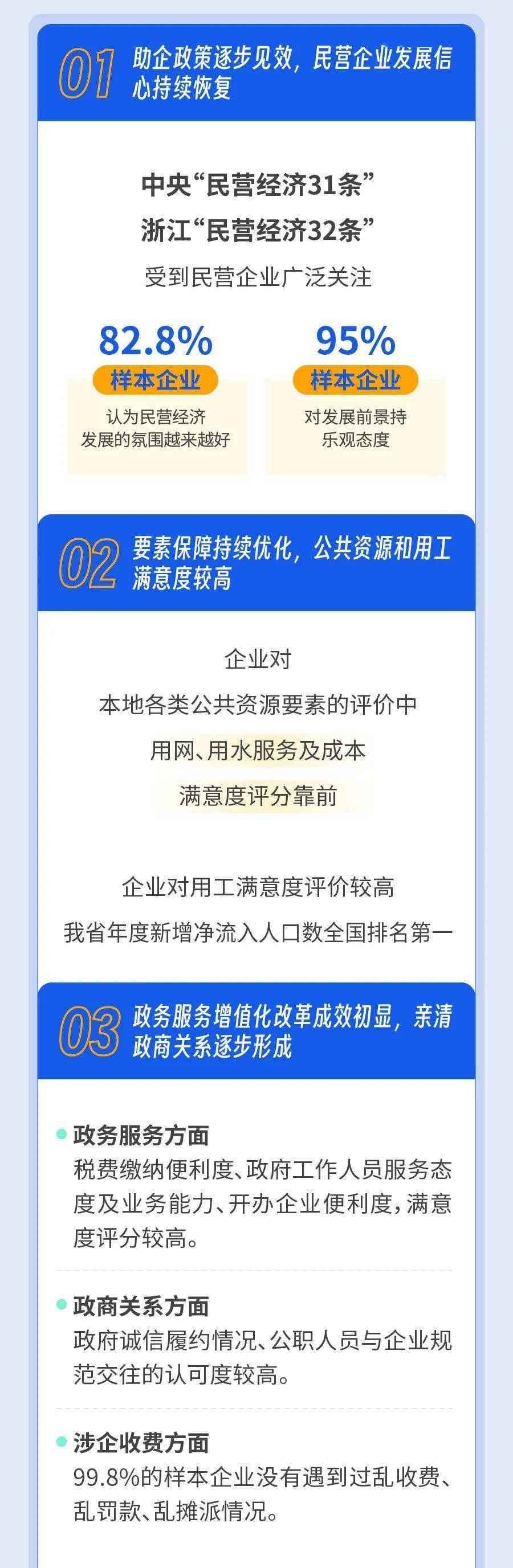 根據(jù)全國工商聯(lián)發(fā)布的2023年度“萬家民營企業(yè)評營商環(huán)境”調查結果,我省營商環(huán)境滿意度位列全國前十,獲評營商環(huán)境最佳口碑省份,省工商聯(lián)開展的萬家民營企業(yè)評營商環(huán)境工作案例被評為全國十大優(yōu)秀實踐案例;杭州、寧波位列全國省會及副省級城市前十,并獲評營商環(huán)境最佳口碑省會及副省級城市,溫州、嘉興、紹興、金華位列全國地級市前十,溫州、金華獲評營商環(huán)境最佳口碑地級市。
