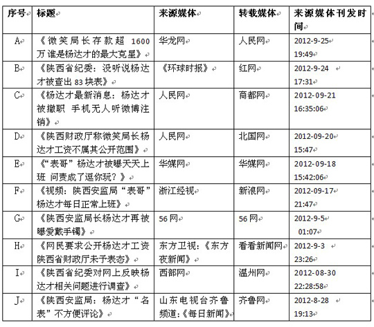 傳統(tǒng)媒體的言論經(jīng)把關(guān)人篩選之后,更具理性色彩和引導(dǎo)作用,人民日報(bào)、新華社、黨報(bào)等權(quán)威媒體的評(píng)論文章更兼具著強(qiáng)大的輿論引導(dǎo)功能。例如,8月29日,《濟(jì)南日報(bào)》的評(píng)論《官員“笑場”可以有,腐敗不能有》稱:“對于楊達(dá)才的追問應(yīng)集中在表上:不僅要追問楊達(dá)才本人,也要追問其單位和紀(jì)檢部門。”[11]再如,9月19日,新華社記者白靖利發(fā)表文章《莫讓輿論熱點(diǎn)成為“斷頭新聞”》,將矛頭直指陜西省紀(jì)委的查處速度。