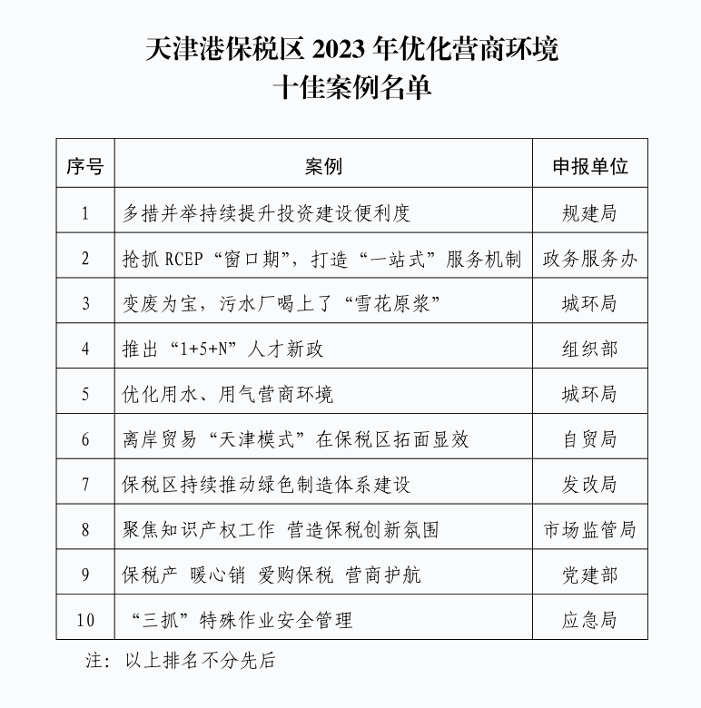 2023年天津港保稅區(qū)堅持深入貫徹黨中央、國務院關于優(yōu)化營商環(huán)境工作的重要部署,落實市委市政府“十項行動”工作要求、濱海新區(qū)高質量發(fā)展支撐引領行動方案,對標國際高標準經貿規(guī)則,進一步激發(fā)市場活力,加快打造市場化、法治化、國際化的營商環(huán)境高地,充分釋放營商環(huán)境改革的“生產力效應”。